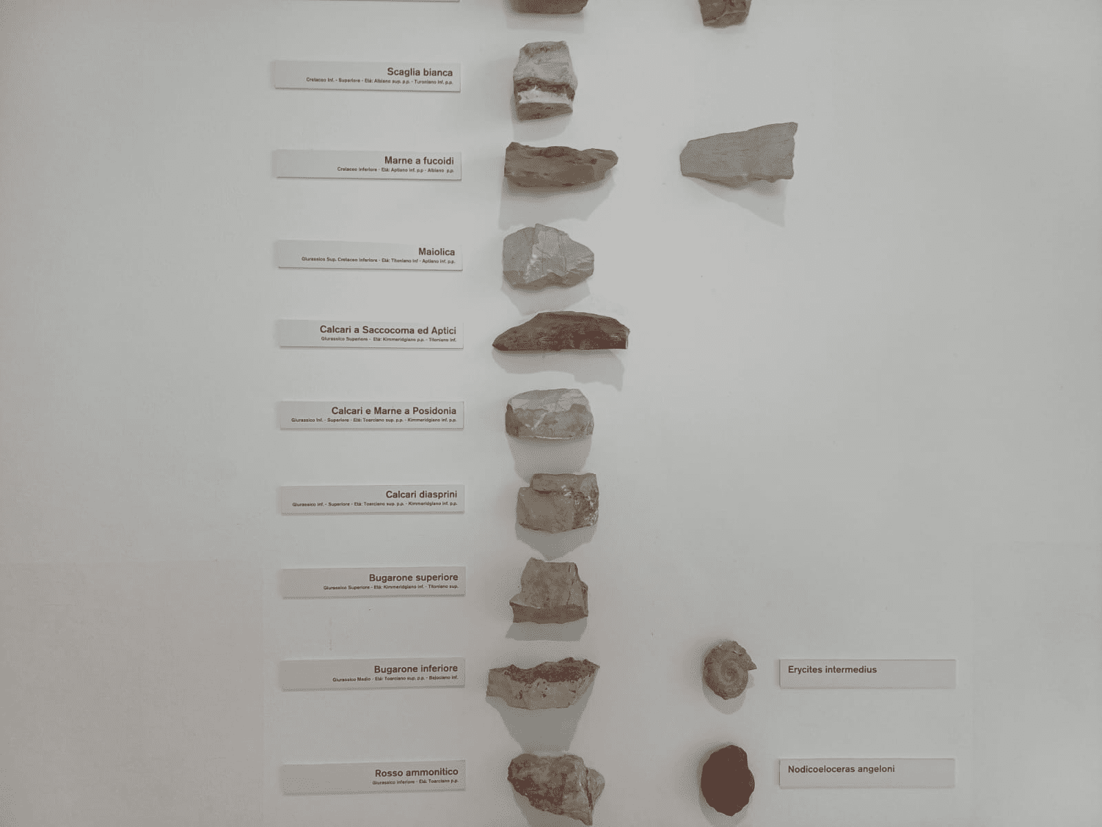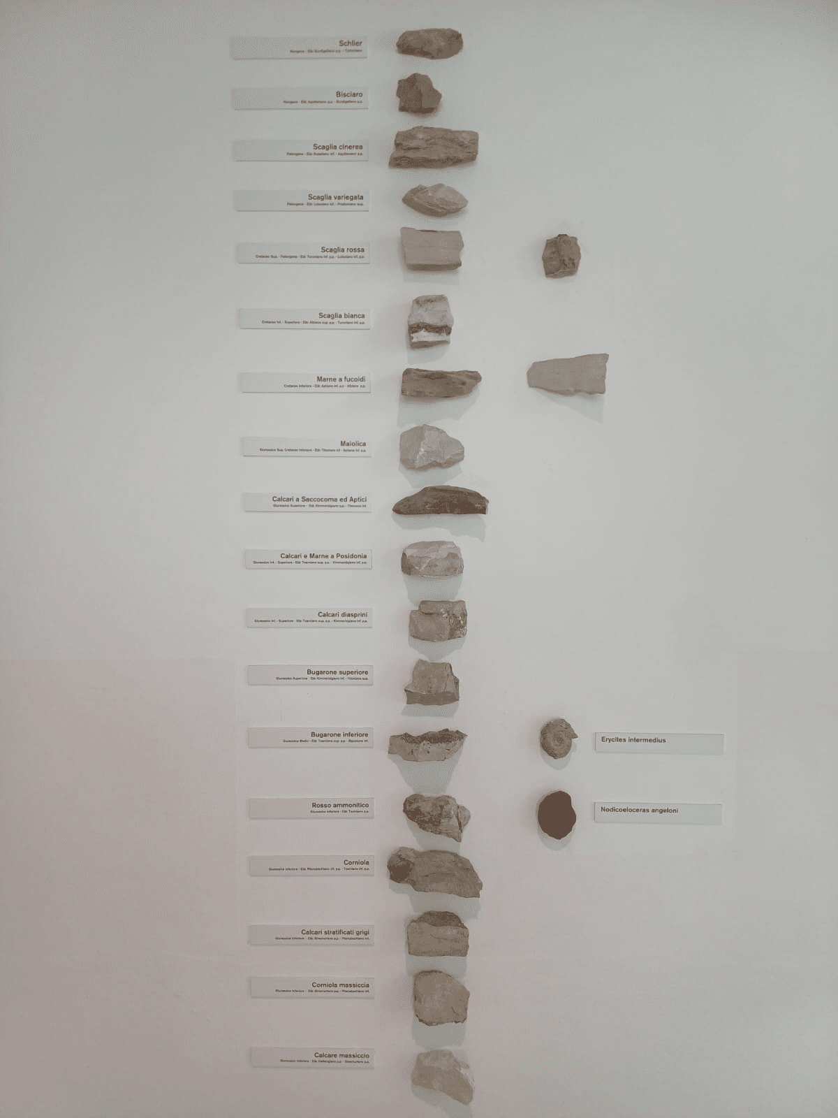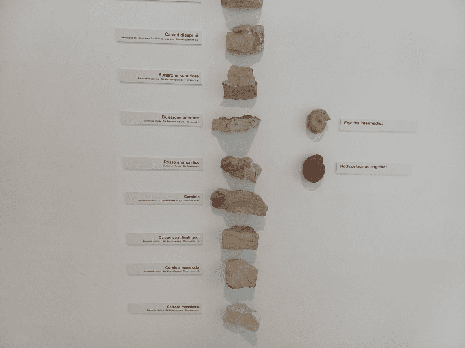 Le teche esposte in questo corridoio ospitano una ricca collezione di ammoniti, molluschi cefalopodi ormai estinti, vissuti sulla Terra a partire da circa 330 milioni di anni fa e scomparsi intorno a 65 milioni di anni fa, in concomitanza con l’estinzione di massa che coinvolse anche i dinosauri.